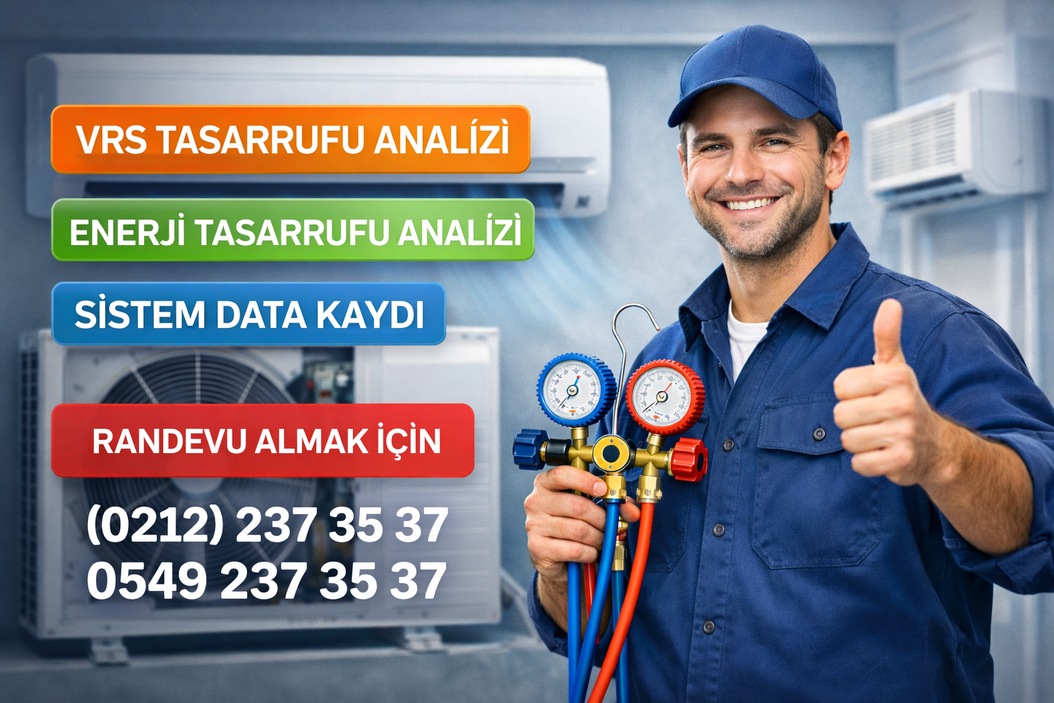 VRS tasarrufu analizi ve enerji tasarrufu çalışmaları kapsamında; sistemin çalışma değerleri kayıt altına alınır, performans raporları oluşturulur ve uzun vadeli çözüm önerileri sunulur. Alanında deneyimli teknik ekibimiz, hızlı servis anlayışı ve temiz işçilik prensibiyle tüm süreçleri titizlikle yürütür.