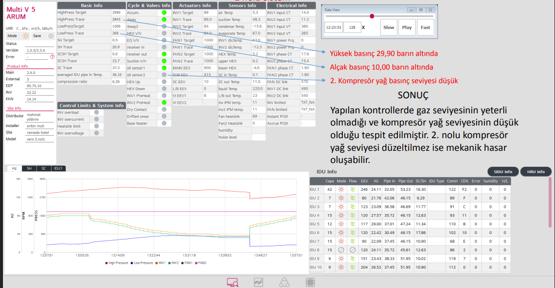 Yapılan kontrollerde gaz seviyesinin yetersiz olduğu ve kompresör yağ basıncının düşük olduğu tespit edilmiştir.